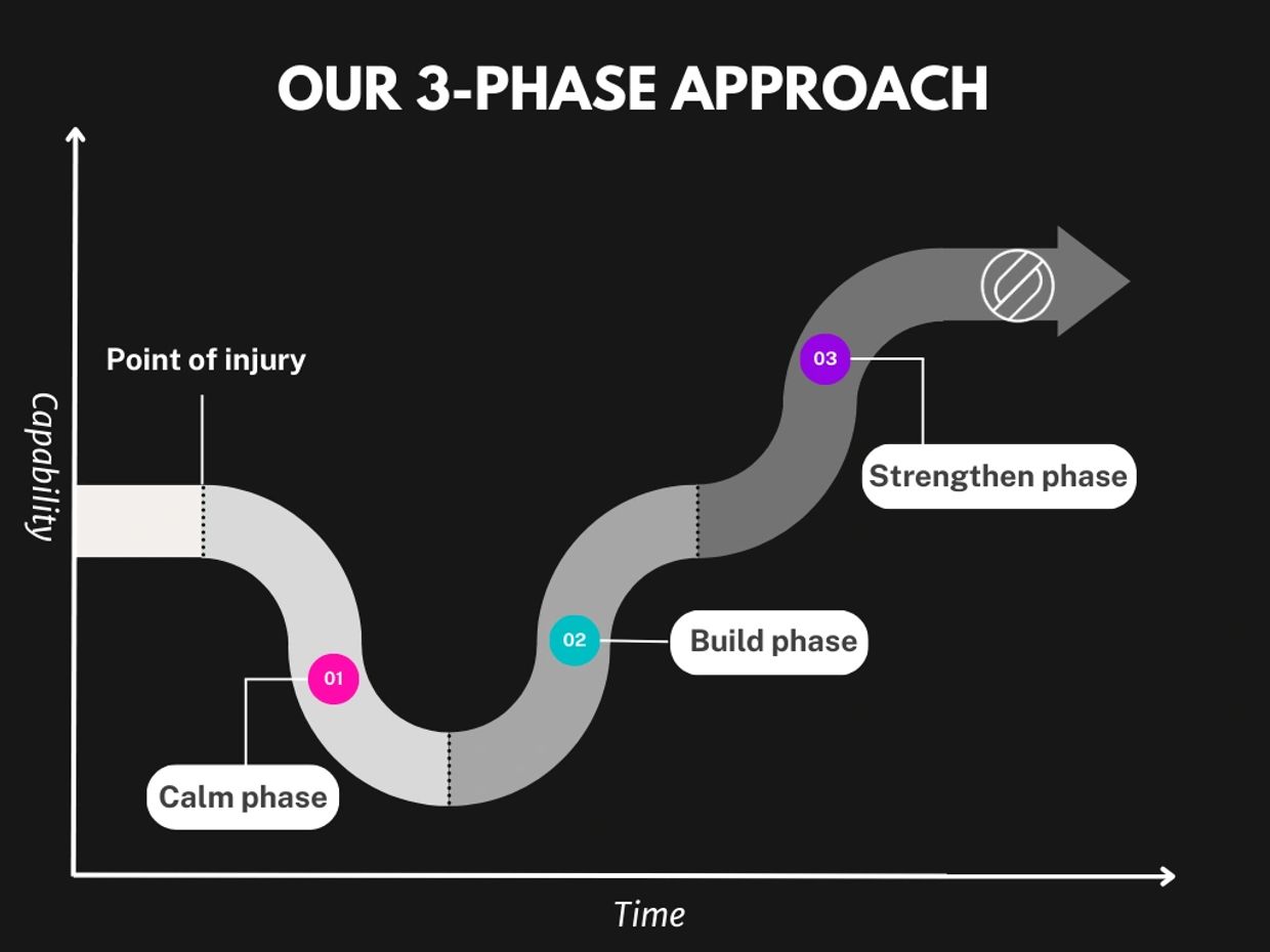 damn. you’ve just injured yourself. now, what? depending on how bad things are, you will likely need a period of letting the injured area settle down a bit. this doesn't mean you’ve got to quickly drop everything you're doing and rest completely. rather, the art is to find a sweet spot we like to call ‘optimal loading’. this means we want to get the injured area moving and working just enough to signal proper healing processes, without under-working it and causing significant deterioration in your capabilities. we like to call this the Calm Phase. this may require some modifications to your usual activities for a little bit coupled with using pain relieving techniques such as massage, joint mobilisations, and exercise to help “calm sh*t down”. we will work with you to the absolute best of our ability to avoid saying “stop entirely." of course if we mutually decide this is the best option, it won’t be for long and we will outline the steps you need to take to get you back to what you love. inevitably during this phase, your capabilities will drop slightly due to the acute nature of your injury. how steep and long this drop is can depend on many factors, but with our expertise we will help find your sweet spot and mitigate these losses.
